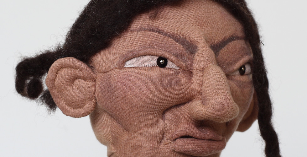 And so I begin to create my own puppet troupe. I begin at first with reluctance. Doubt really. And then I gain courage and speed. And one by one, puppet by puppet, I proceed. I dye fabrics all the shades of brown that the packaged dyes will permit, light brown, pink brown, dark brown, cocoa brown. I mix shades with shades. Then from these shades, I sew noses, wide ones, short ones, all sorts of noses . Sometimes I make dark eyes and curly hair, other times a bald men with a purple skirt appears. I form happy and sad and angry and mad. I don’t even know what I’m making sometimes. All I know is I create what was missing, or so I try. And in this visual unearthing of identity, I sometimes make what I least want to. So an unwelcome ancestor shows up as a cute Spanish conquistador. And I doubt again. Where is that brown goddess of strength and resilience I so seek? And so I continue. Today I am making Madremonte, a Colombian diety, a mischievous, enraged protector of the mountains and forest. She is a work-in-progress and perhaps she is not the goddess I seek but she brings me one step closer. And with that, I feel delight.